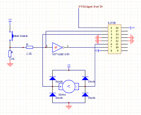 Our targets were to move left and right inside C-channel rails, and we wanted them to be able to change directions autonomously. We created a full H-bridge with a L293B push-pull driver to allow our motors to turn in both directions. In order to provide the proper direction control on the L293B chip, a HC14 Schmidtt trigger inverter is used to invert the signal from a slide switch mounted on our motors. The relation between inverter input and output signals are used by the push-pull driver to determine motor rotation direction. If the inverter input state changes due to the slide switch position, the polarity of the current across the motor also changes, which causes the motor rotation direction to change.