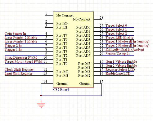 Below is a circuit diagram of how we utilized the pinouts of the C32 board. To view individual components and the circuits associated with them, please select from the icons above. To download a Protel DXP Project with all our circuits, please right click here and save link as.