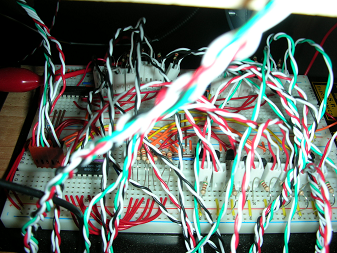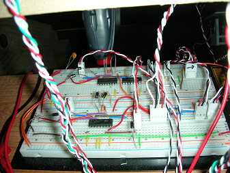 The electronics required by our game were complex but able to be divided onto three protoboards, as seen below. Our game utilized the class-provided Motorola MC912C32 microcontroller on a board with protective circuitry in order to control and sense multiple input and outputs as needed by our game.