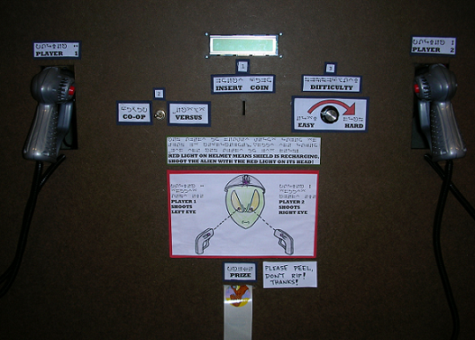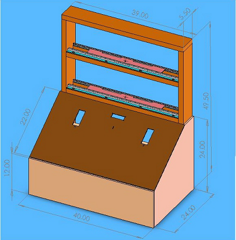 The console top panel is the area where the user inserts a penny, reads game directions, selects game type and game difficulty, observe the current game score and timer, retrieves and stores guns, and retrieve prizes. The rest of the console consists of a masonite front and particle board sides attached to the wooden frame to create a wide, sturdy base for the entire game. The top panel is made of masonite that was Lasercammed to create the appropriate holes needed, such as for the coin slot, gun storage, LCD display. |
