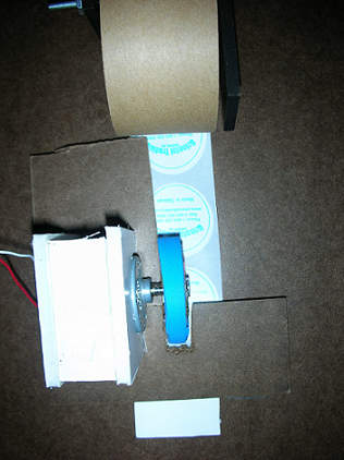 | We decided to use short motor pulses to dispense a couple of stickers on a strip of stickers from a roll as the game's prize. The sticker roll hangs on a horizontal bar attached underneath the console top panel, with its free end of the strip pointing towards a slot near the bottom of the console. A motor (mounted in a foamcore cradle) with a foam wheel on its shaft (constructed with layers of decorative foam) pressing on the sticker strip against the underside of the console top panel pulls the sticker strip towards the slot as the wheel rotates. To prevent the sticker strip from misaligning with the dispensing slot and looping against itself before reaching the slot, the sticker strip travels through a thin channel under a masonite plate attached to the underside of the console top panel. In addition, a foamcore block at the end forces the dispensing slot to be the only exit for the sticker strip. |