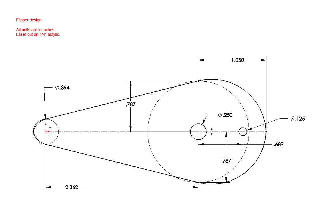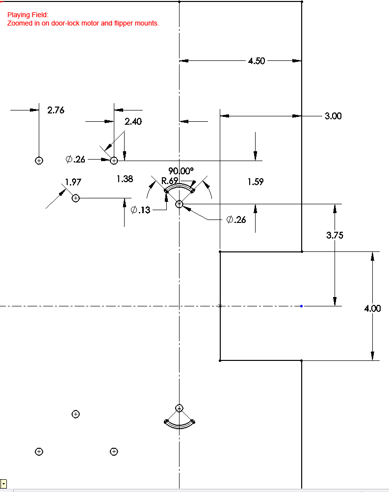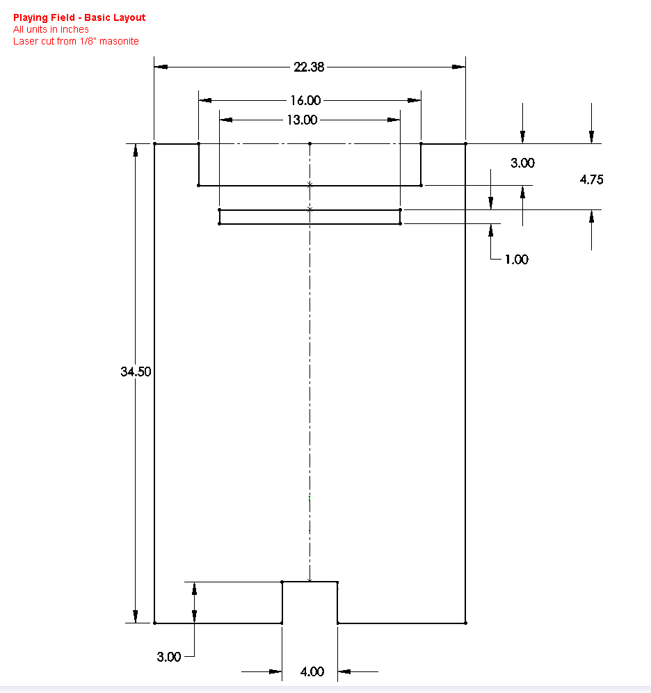 The mechanical design of the soccer pinball game was something of an evolutionary process. Unlike many teams, we severely limited our use of the laser cam and CAD, and started the project early by building a sturdy wood frame with the dimensions specified in the project assignment (2' x 3'). The mechanical simplicity of our game, and our use of scavenged mechanicals for the most complicated components of the drive train, such as the goalie drive, meant that only the playing field itself, and the flipper surfaces needed to be laser cut. Dimensioned drawings of each of these components are below. All other mechanicals were fabricated using hard board and foam core with simple cutting tools.